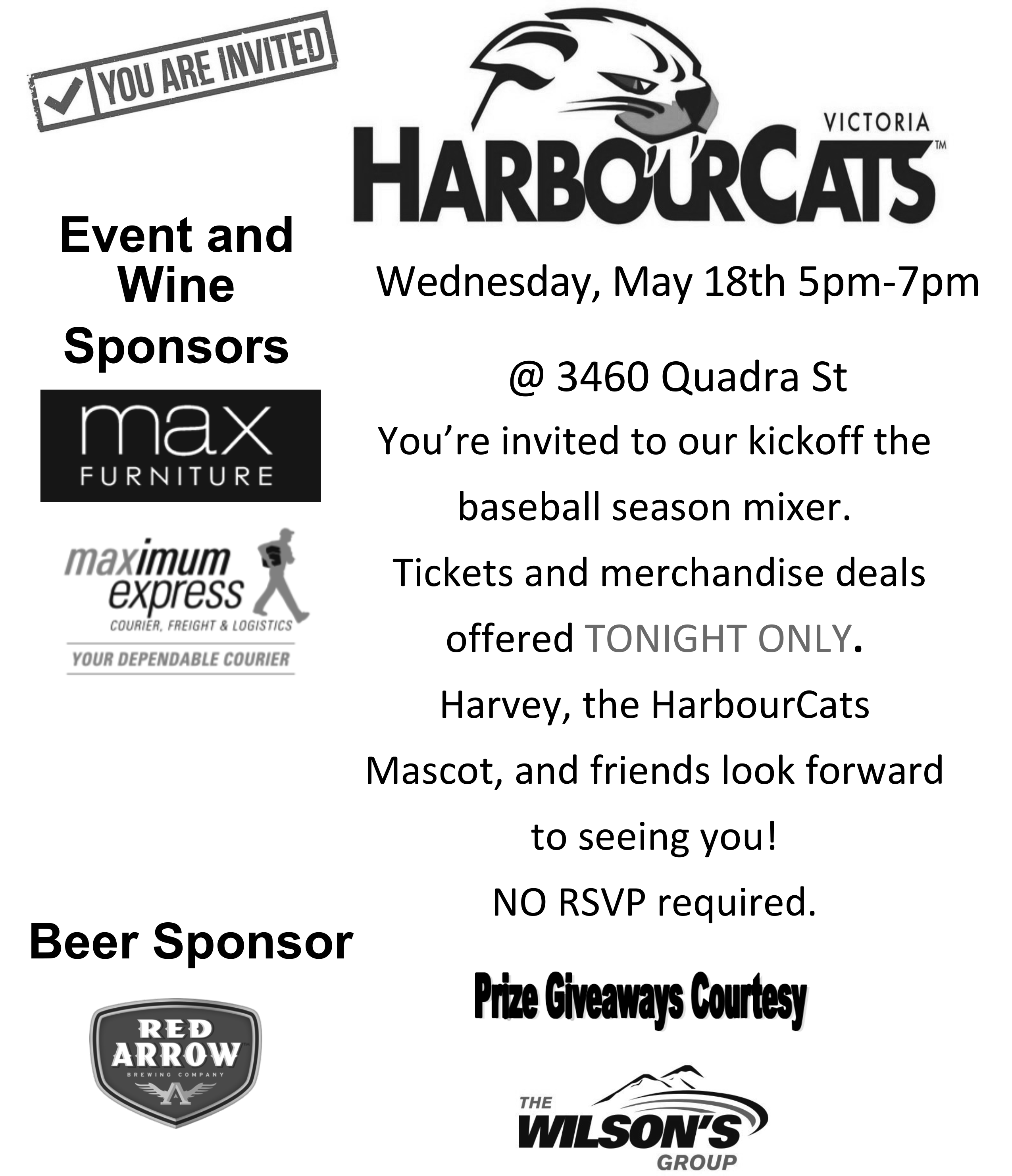 If you can’t make the event, never fear, you can pick up your tickets at the HarbourCats office at 101-1814 Vancouver Street. Open M-F 9AM to 5PM.