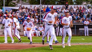 One of the standout days on the calendar is always Mayfair Optometric’s annual School Spirit Day. Cam Schneider made this season’s game a memorable one hitting a walk-off single in extra innings to beat the Nanaimo NightOwls 2-1 in front of over 5000 fans.