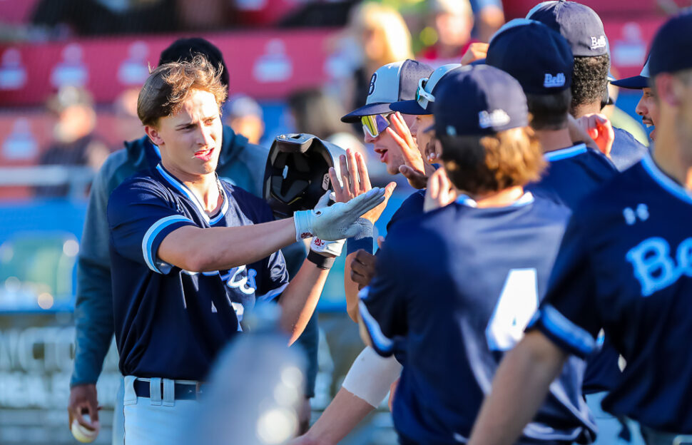 Above Photo: Bellingham players celebrate Elijah Hainline’s leadoff homerun on Tuesday night (Photo: Christian J Stewart)