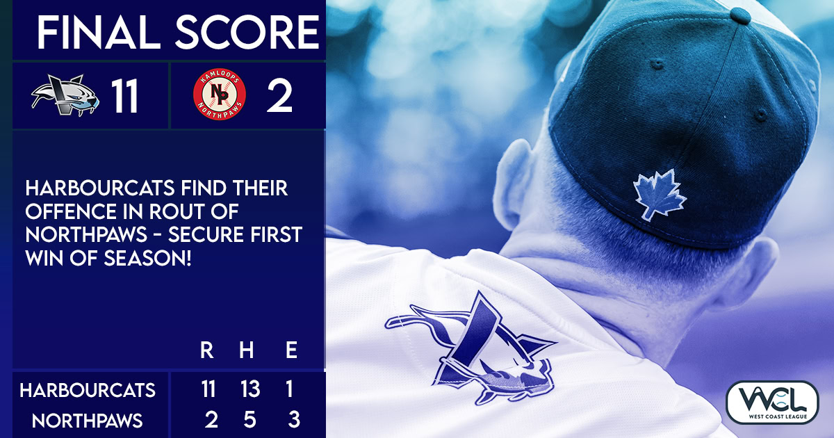 June 1, 2024, Kamloops, BC – The Victoria HarbourCats used a six-run second inning to cruise to a 11-2 win over the Kamloops NorthPaws Saturday evening in West Coast League baseball action at Norbrock Stadium in Kamloops.