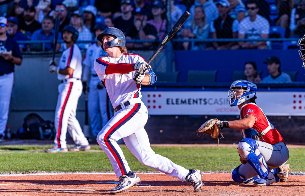 Above: Logan Shepherd belts one of his eight home runs on the season against Wenatchee on July 27th. Shepherd earned All WCL first team honours for his play this season (Photo: Christian J. Stewart).