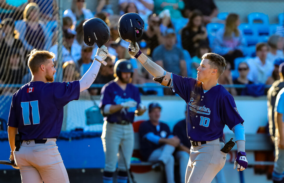 Above Photo: Edmonton players celebrate Clayton Loranger’s second inning home run on Friday night (Photo: Christian J Stewart)