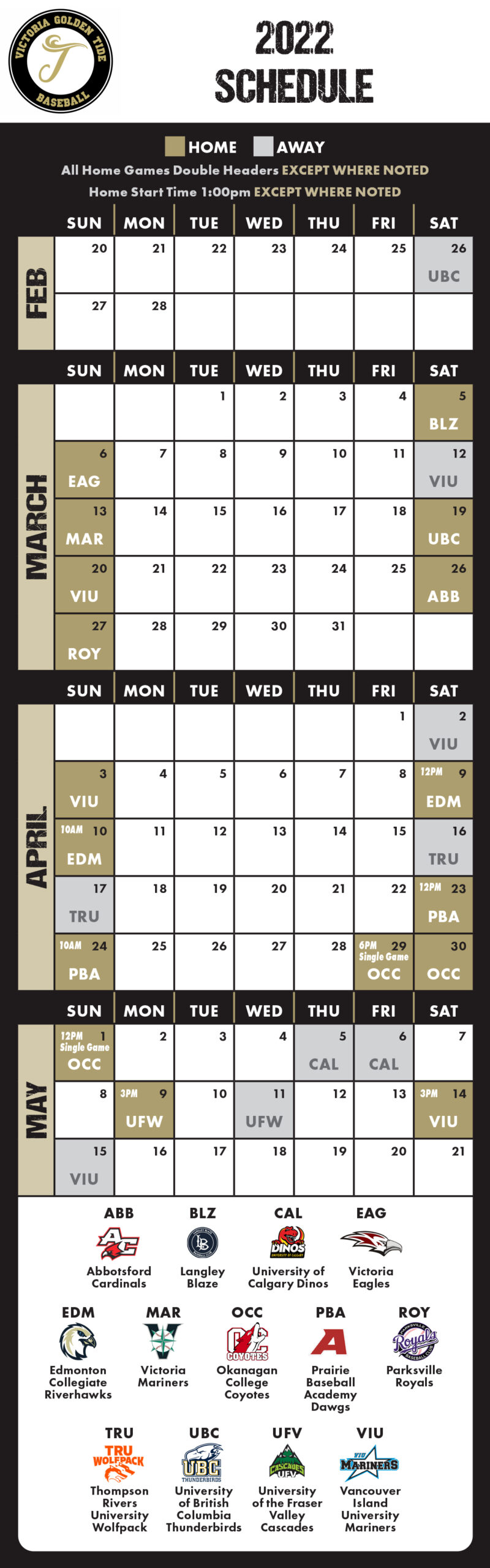 The full 2022 Golden Tide schedule can be found in the graphic attached here. All games on the schedule are double-headers, with the exception of single games on Friday night April 29 and Sunday afternoon May 1 (both vs. Okanagan College). This makes for a 50-game spring schedule overall, 32 of which will be played at home.