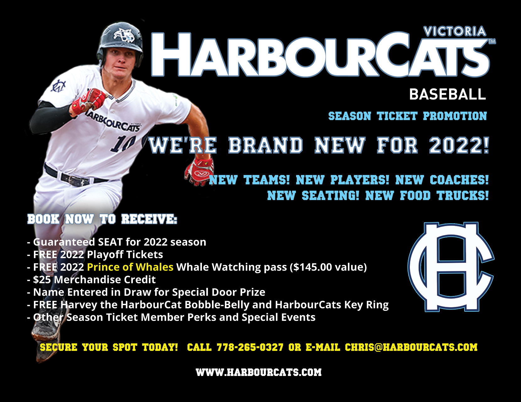 “The biggest thing this schedule reminds us of is how appreciative we are of our season members and corporate partners who have stayed with us through this — each and every one,” said Stewart. “We all knew the situation, and the work to keep the faith and be ready for a return to play. There hasn’t been much activity at our park since August of 2019, aside from our new CCBC college team Victoria Golden Tide, so we’re anxious to animate the facility again, with our loyal supporters and put on the full show that is HarbourCats baseball!”