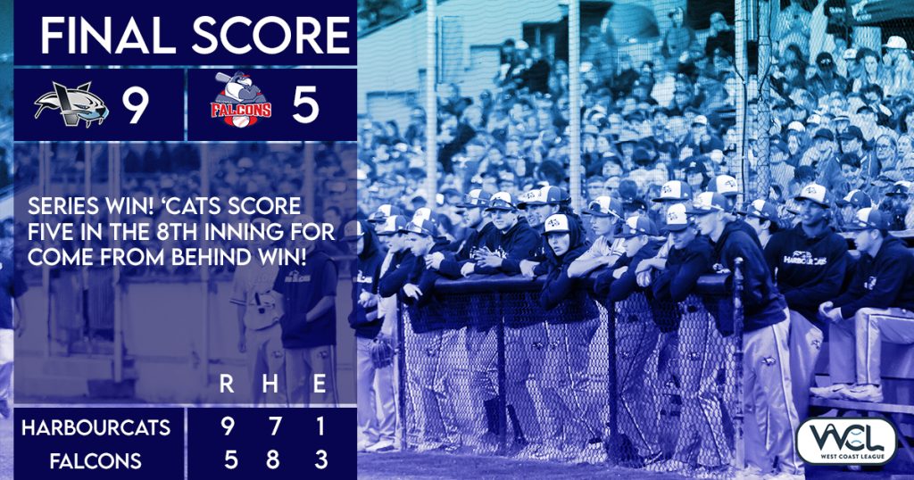 Kelowna, BC – Camden Sos had three hits and scored three runs and the HarbourCats scored five times in the eighth inning, to overcome a 5-4 deficit and defeat the Kelowna Falcons 9-5 Wednesday night in West Coast League action at Elks Stadium in Kelowna.