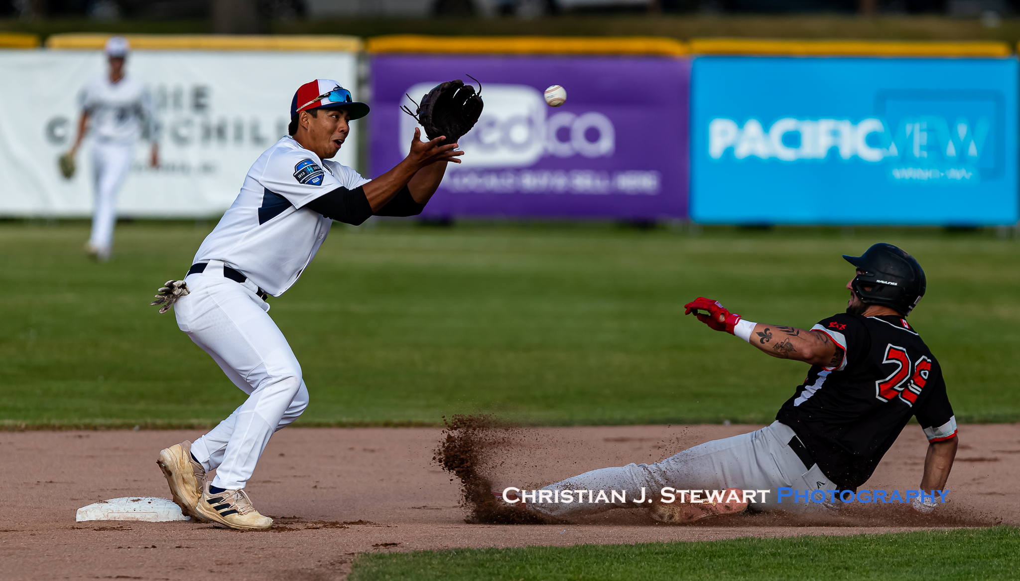 HarbourCats second baseman Phoenix Sommay awaits the throw during a Kamloops stolen base attempt.