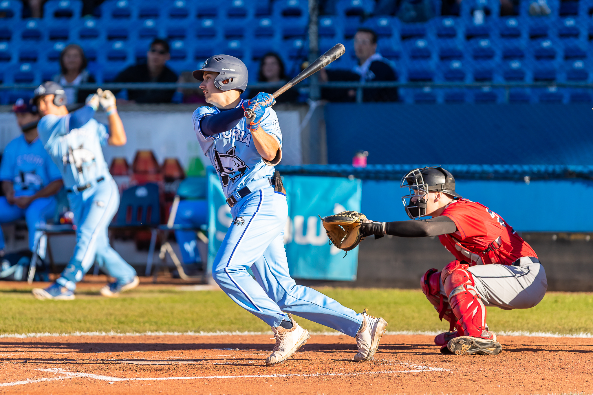 Shane Jamison, who joined the club over the weekend, decided to get involved again and got a hold of a 2-0 off speed pitch from Vassar. It flew deep into the Victoria sunset for a long home run to announce his arrival to the club and signal the end of the night for Vassar with the Cats up 4-0.