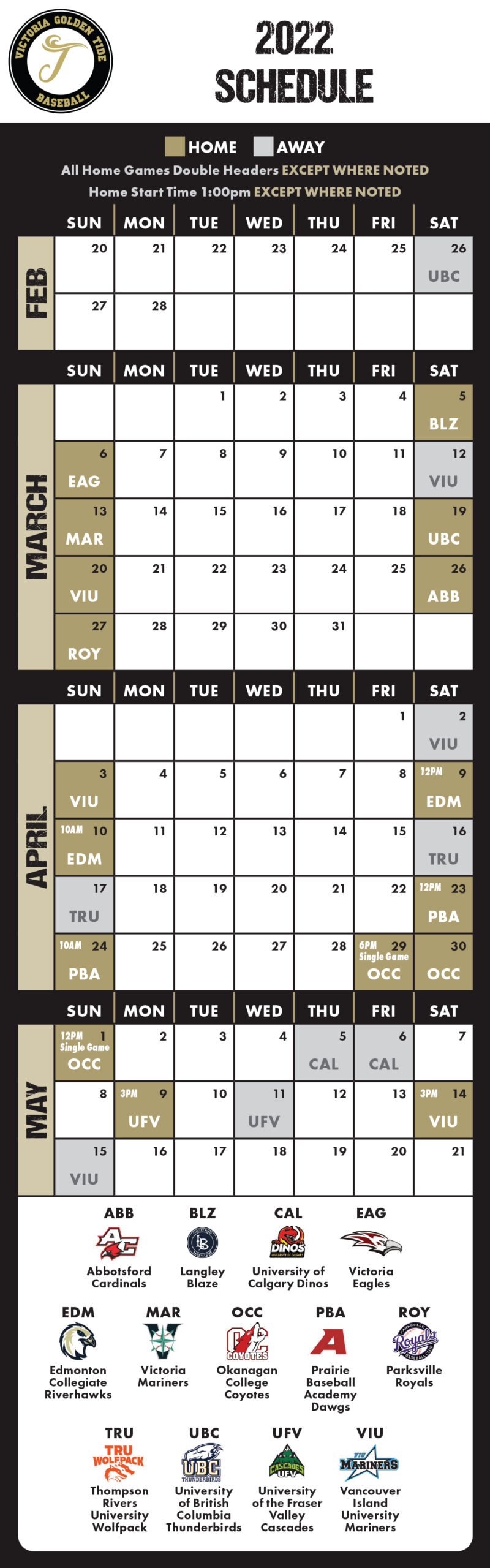The Tide will then play 16 more league home games, through to May 14th, before wrapping the season with another trip to VIU on May 15th (see full schedule below).