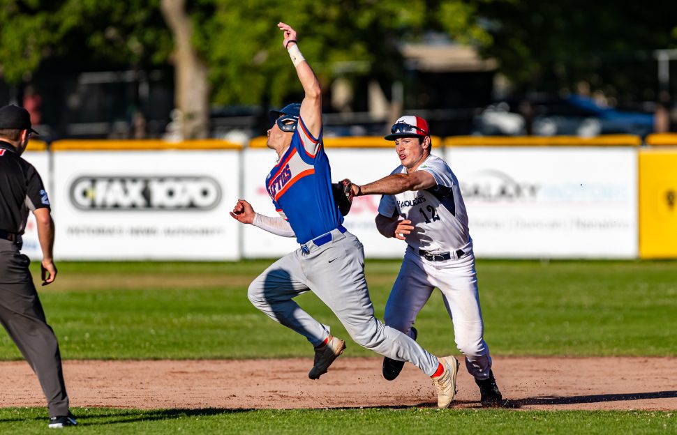 HarbourCats second baseman Dallas Macias (12) puts the tag on Lefties baserunner Mauricio Guardado (20) during third inning action Thursday (Photo: Christian J. Stewart)