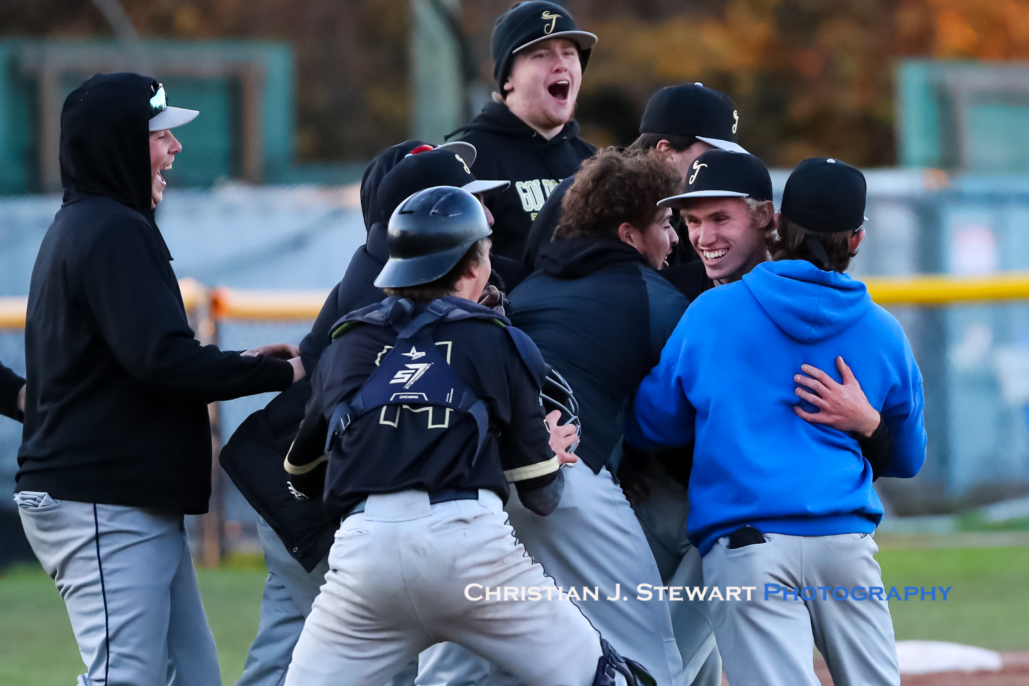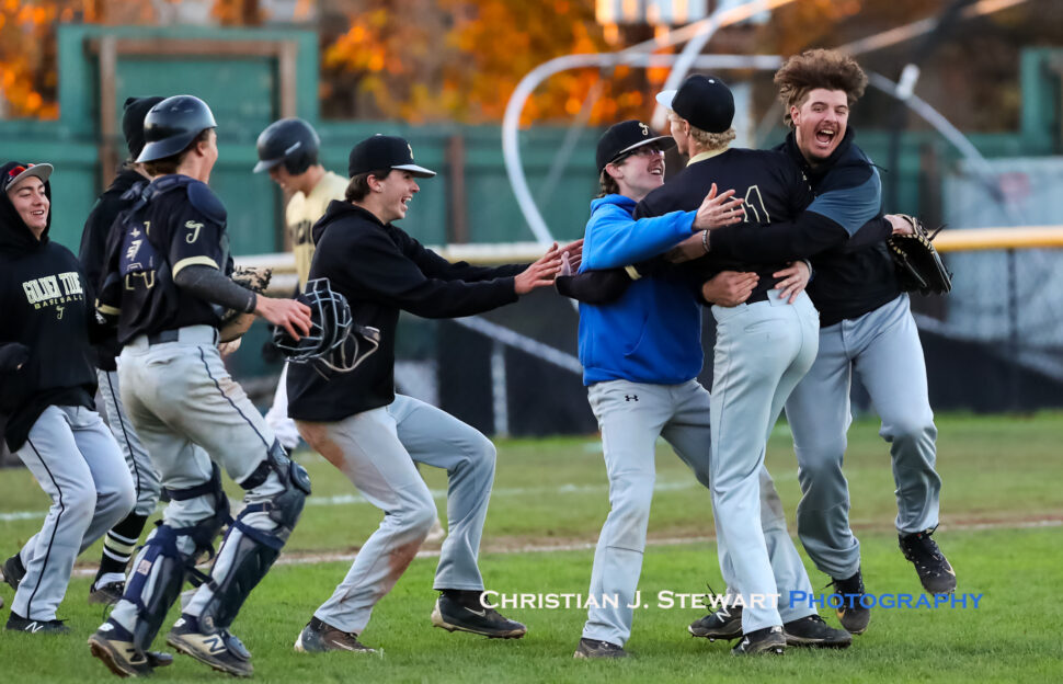 While Team Gold’s Bret Czarkowski walks off the field in the background. Team Black pitcher Ethan Dean (right) prepares to get mobbed by Ethan Keats (blue hoodie) and Zeke Holt.