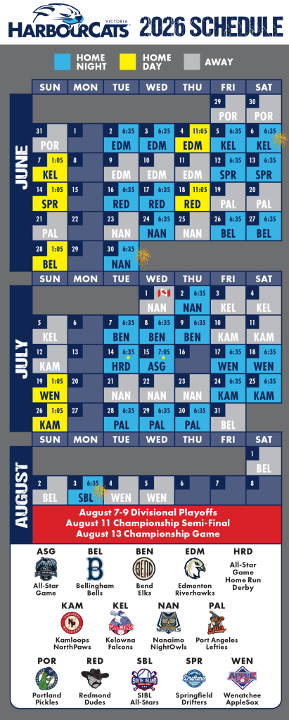- Single Games – SINGLE GAME TICKETS FOR THE 2026 SEASON are now available and may be purchased HERE! Fans can also call 778-265-0327 to order. Also available at HarbourCats offices at 1814 Vancouver St.