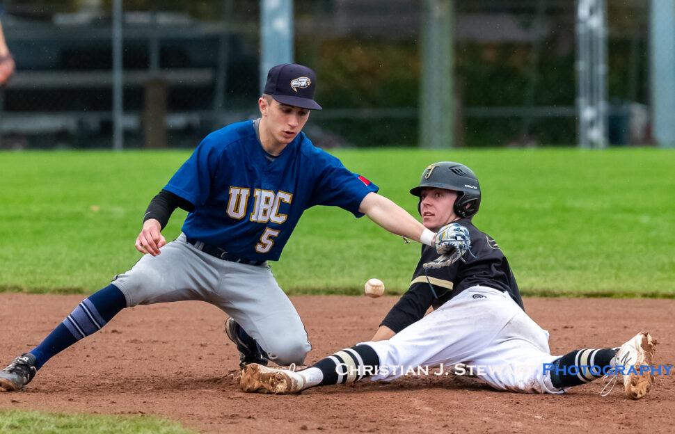 Above: Victoria’s Brandon Green is safe at second as the throw escapes UBC second baseman Brett Zazuluk.