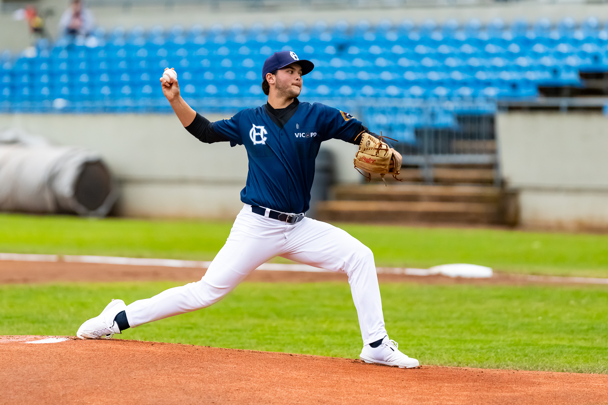 The umpires called a stop to the game during the bottom of the second with the HarbourCats sitting with the bases loaded and one out. After waiting for an hour and a half for the rain to subside and some absorbent was applied to appropriate areas, the HarbourCats pushed five runs across in the bottom of the inning before adding three more in the third. First it was Jake Skipworth with a base hit to score one who then passed the baton to second baseman, Josh Rolling, who responded with an absolute laser of a two run double to left center field. The HarbourCats would then add two more and in the third Luke Cheng’s double down the left field line was the big blow of the inning.